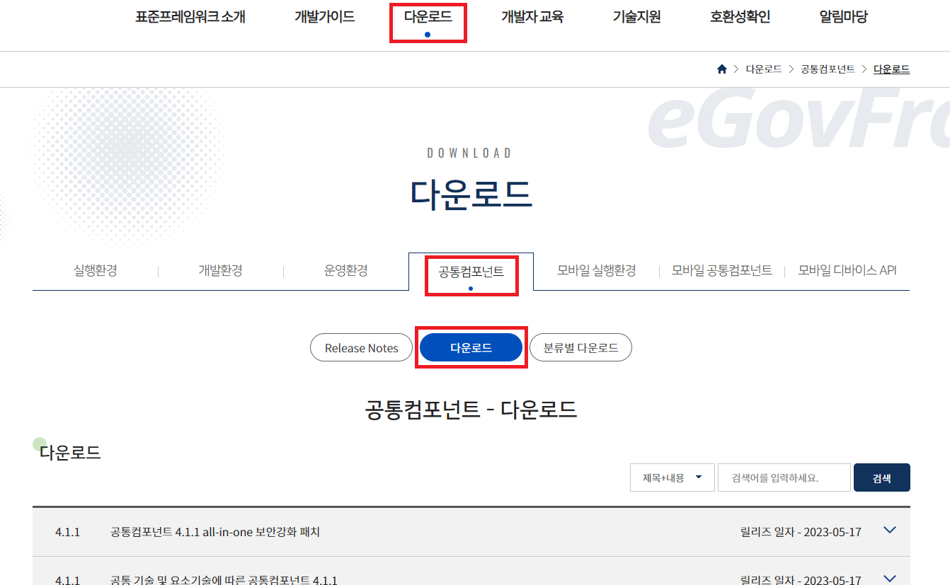 아래 화면은 홈페이지에서 공통 컴포넌트 파일을 다운로드 받는 화면이다.